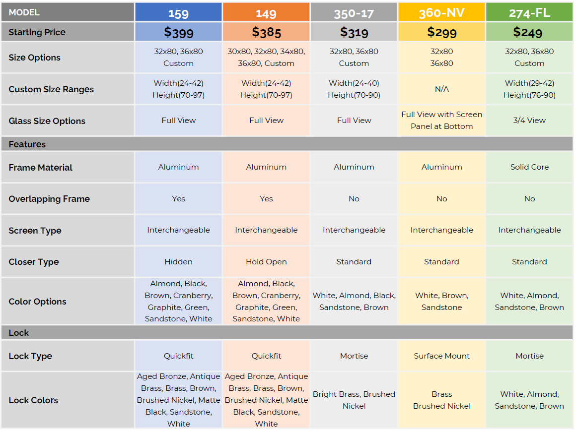 Most standard storm door sizes are 32" and 36" wide, some models are also available in 30" and 34". Custom storm doors are available in many models, up to 8' high.