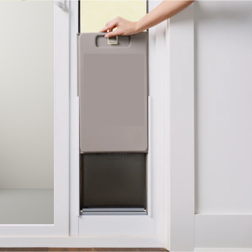 Includes slide-in panel cover to secure pet flap.